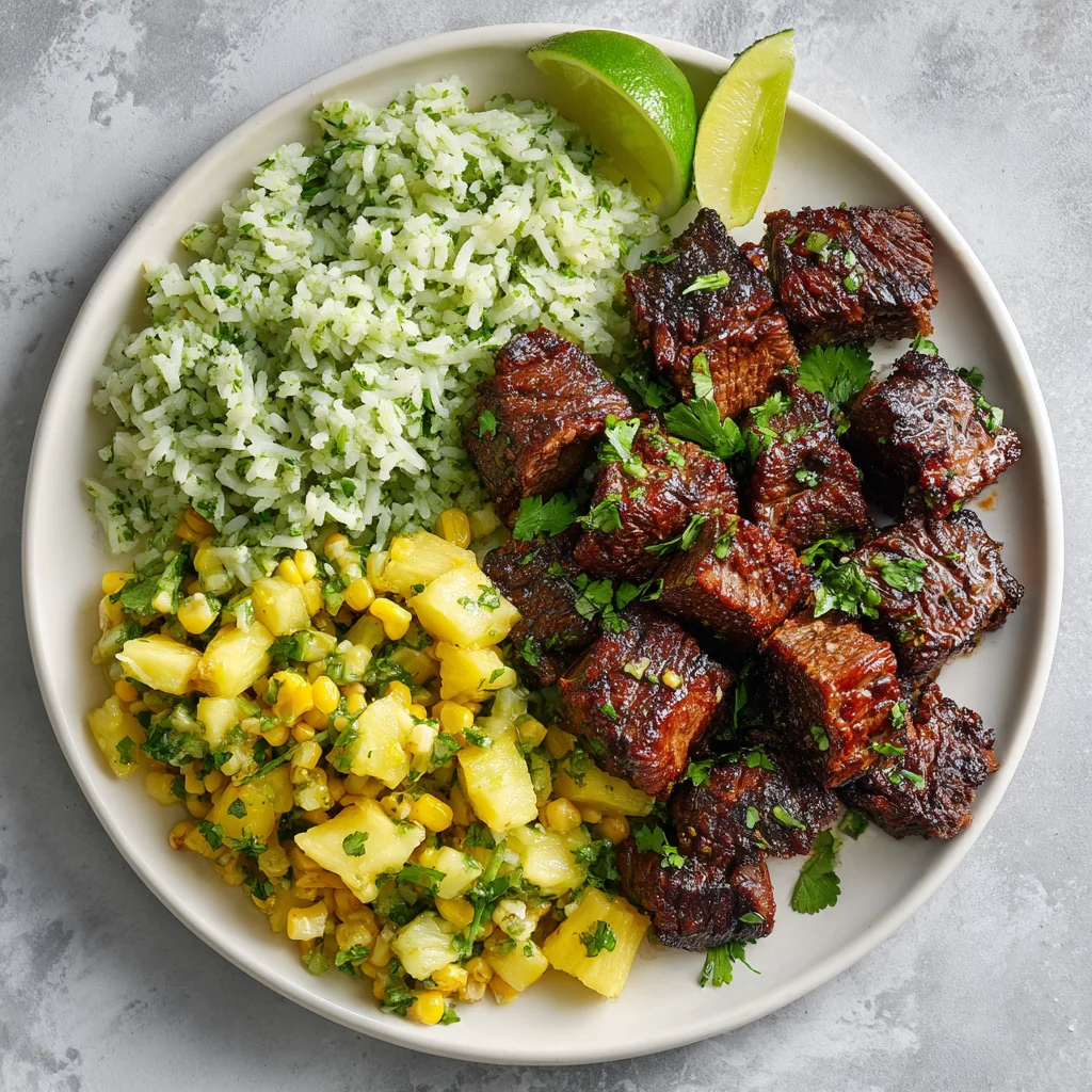 Spiced steak Al Pastor paired with pineapple-corn salsa. Served alongside cilantro lime rice, and garnished with fresh cilantro.