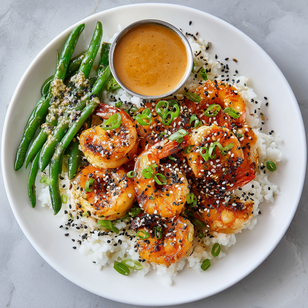 Bang Bang–style sauteed shrimp paired with coconut rice and garlic green beans. Served with Bang Bang sauce on the side and garnished with scallions and sesame seeds.