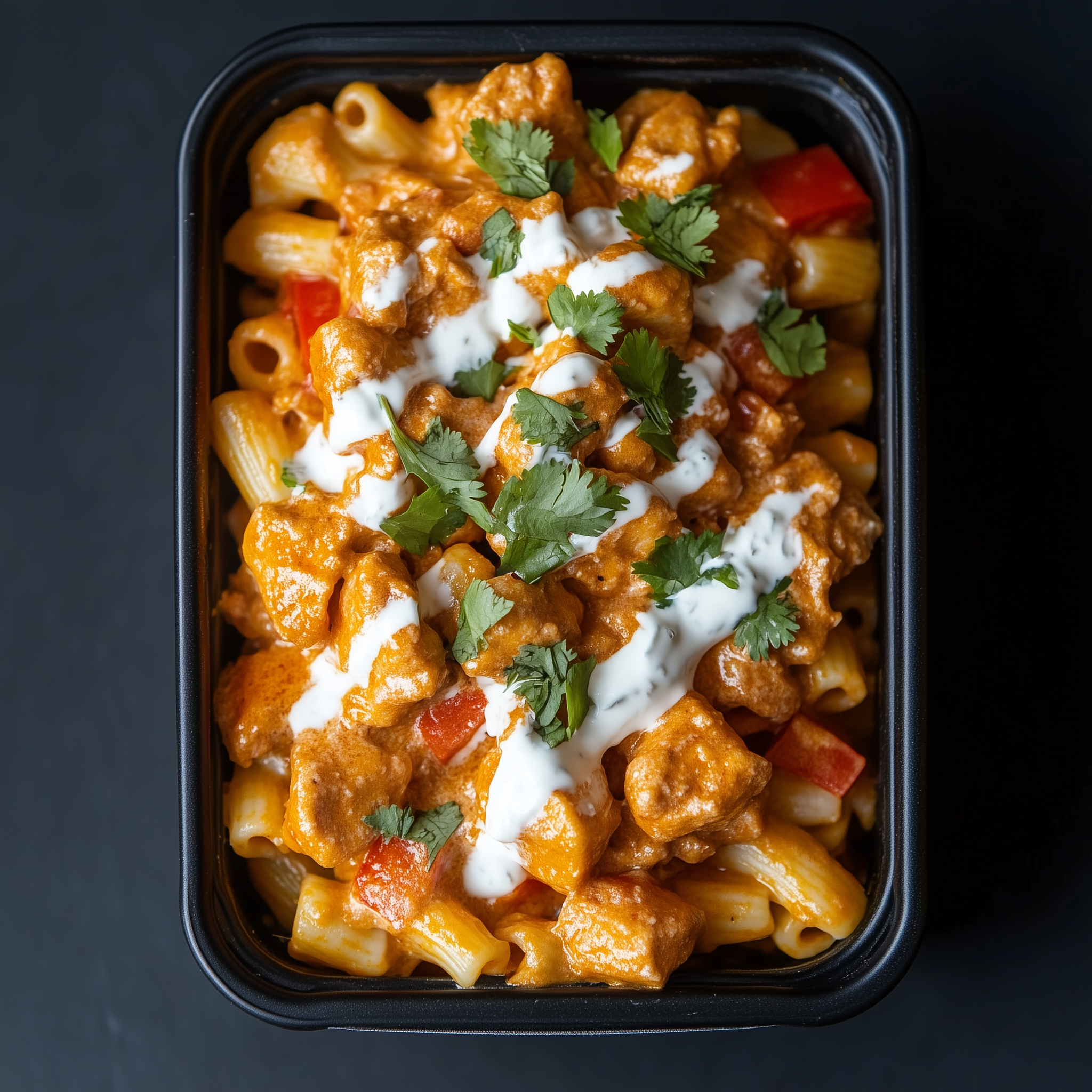 Cubed butter chicken bites layered over macaroni noodles mixed with bell peppers. Garnished with fresh cilantro, and drizzled with coconut cream.