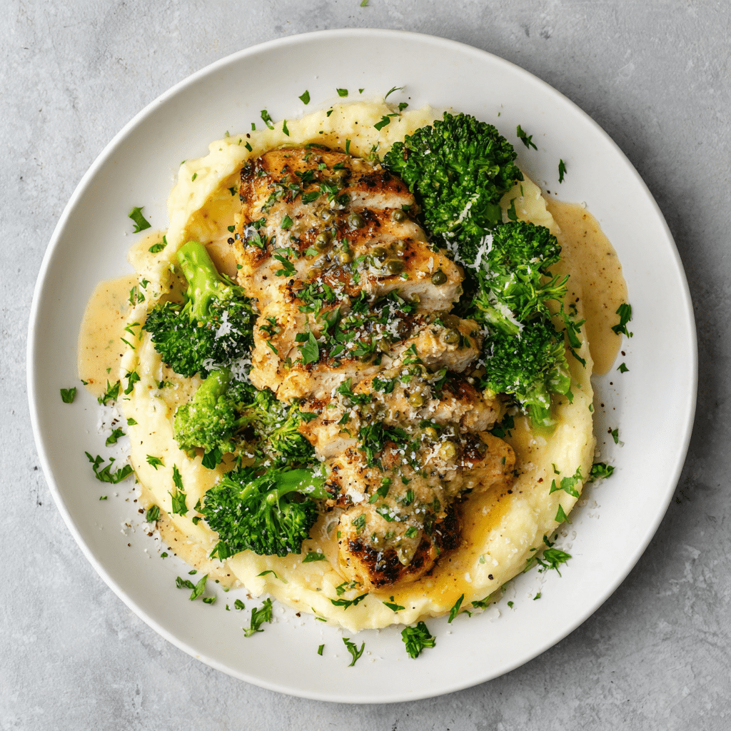 chicken, potatoes, broccoli, olive oil, parsley, capers, lemon, garlic, dijon mustard, salt, pepper, paprika, oregano, butter, lite-cream, garlic powder, onion powder