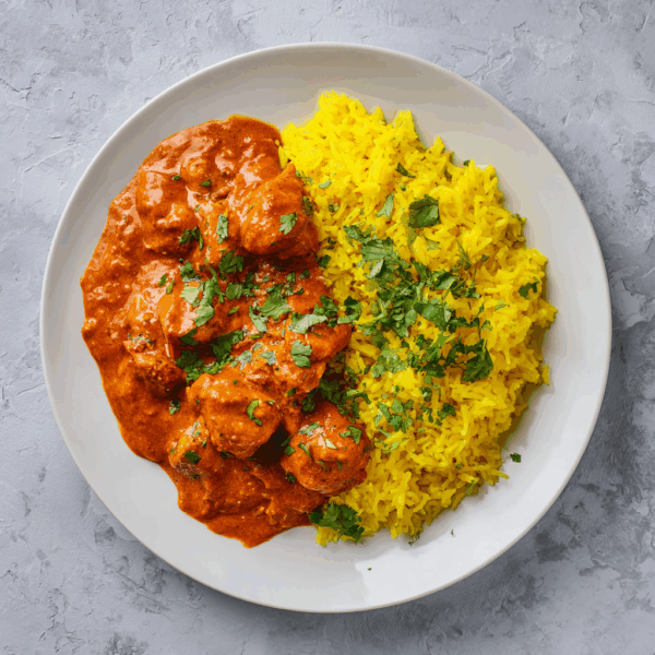 chicken, white rice, greek yogurt, kashmiri red chili powder, avocado oil, cilantro, cucumber, vinegar, red onion, garam masala, turmeric, coriander, lemon juice, ginger paste, garlic, tomato puree, saffron, chili pepper, salt, pepper