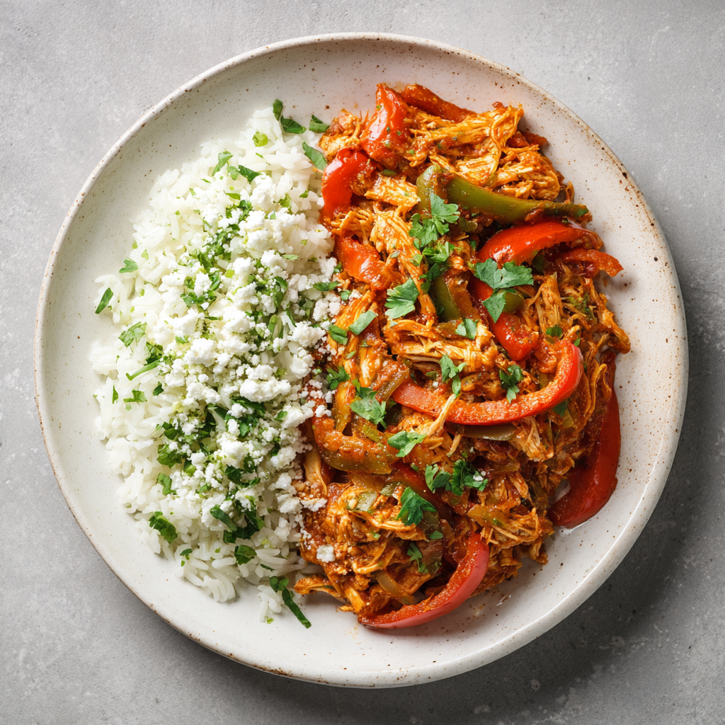 chicken, white rice, avocado oil, bell peppers, onion, lime, cilantro, cotija cheese, adobo peppers, fire-roasted peppers, garlic, chicken broth, oregano, paprika, salt, pepper