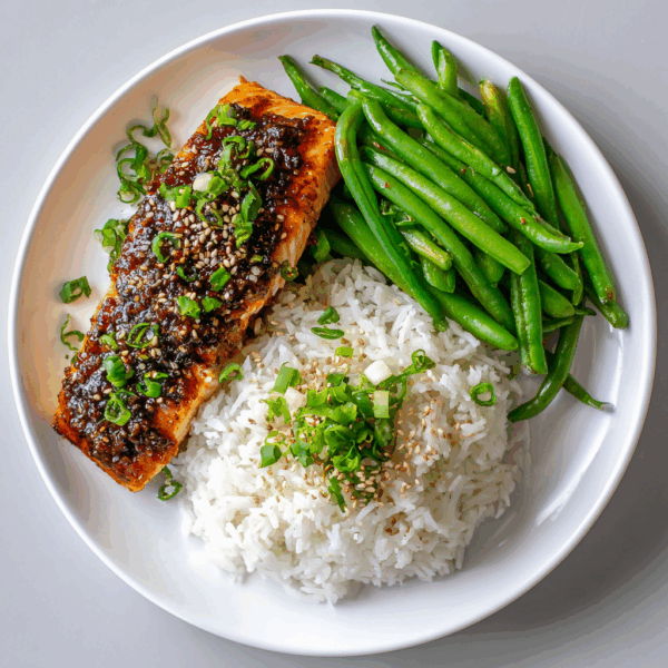 Salmon fillet tossed in Thai chili oil, served with steamed white rice and a side of green beans. Garnished with scallions and sesame seeds.