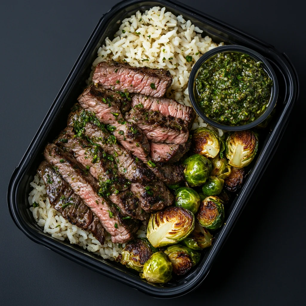 Tender grilled flank steak layered over herb rice paired with Brussel sprouts. Chimichurri sauce and fresh parsley garnish on the side.