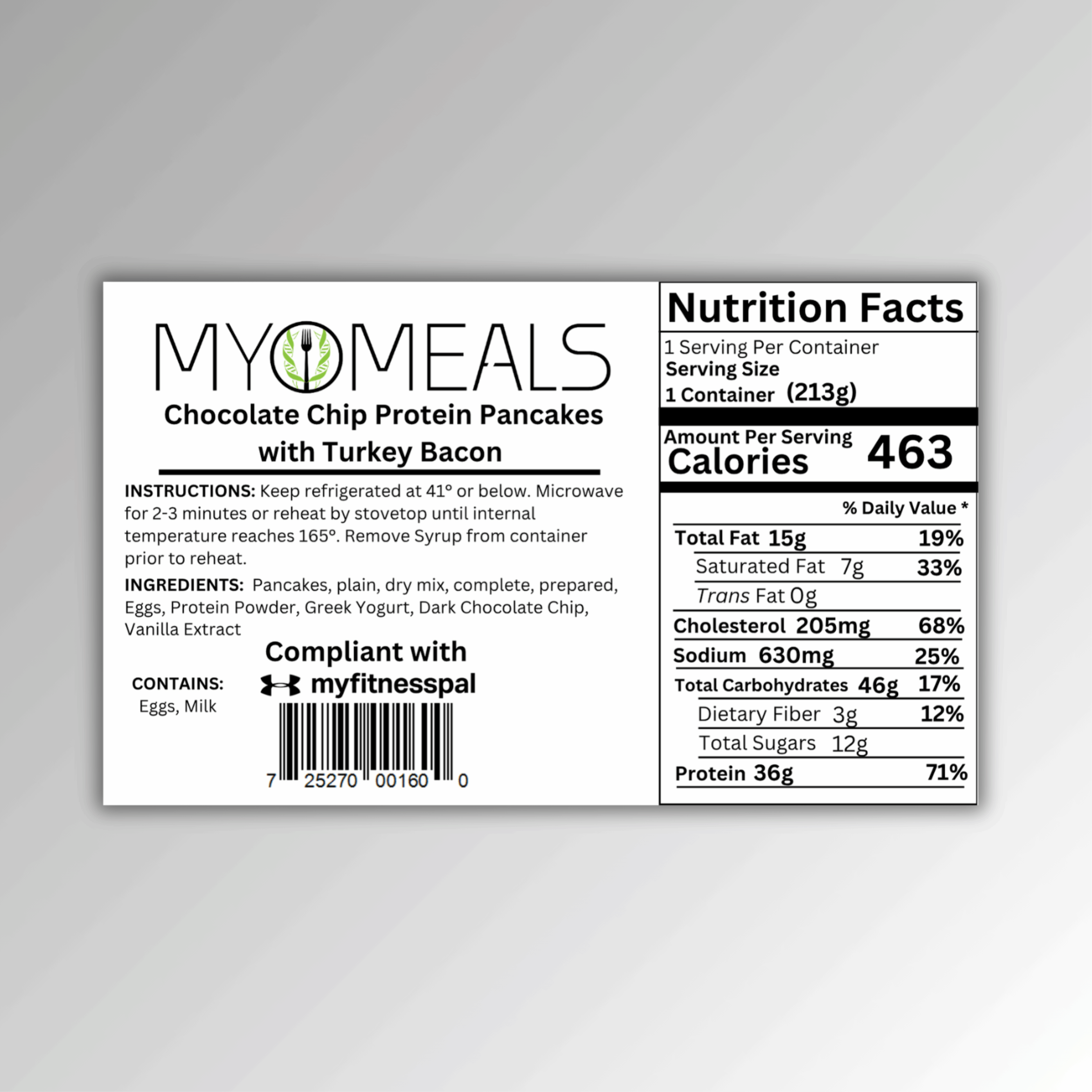 flour, protein powder, greek yogurt, egg, chocolate chips, baking soda, salt, turkey bacon, syrup