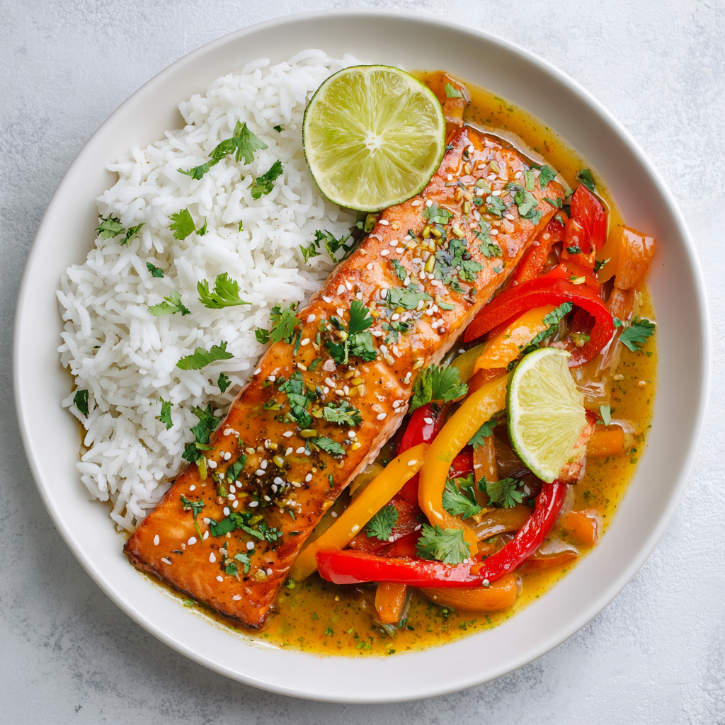 salmon, white rice, bell peppers, lime, sesame seeds, avocado oil, curry paste, coconut milk, cilantro, green onion, garlic, onion, salt, pepper