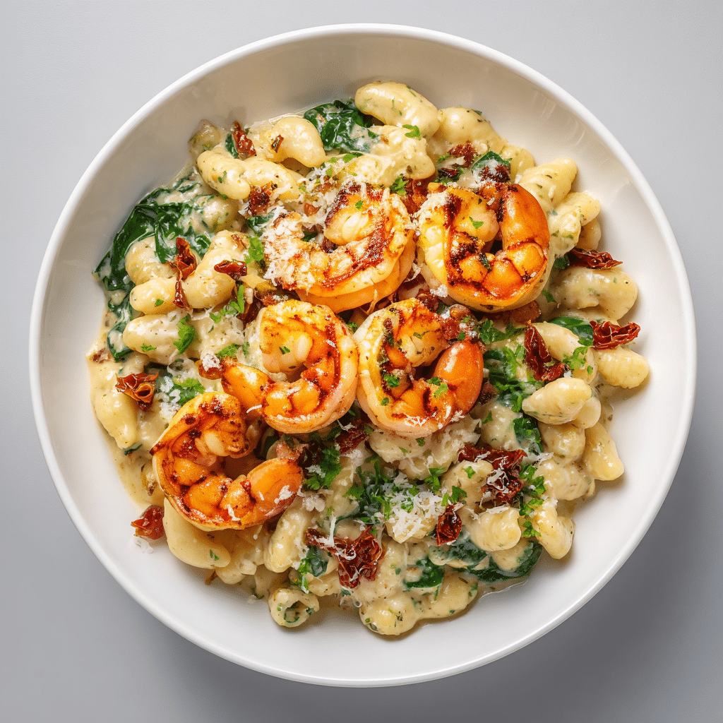 shrimp, cavatelli pasta, spinach, sun-dried tomatoes, garlic, onion, lite-cream, tomato paste, parsley, avocado oil, lemon juice, parmesan, salt, paprika, black pepper, oregano