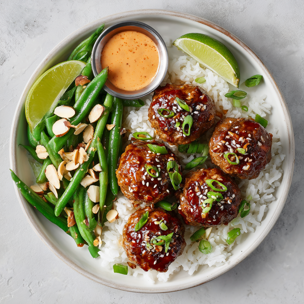 ground beef, white rice, egg, breadcrumbs, soy sauce, garlic, ginger, green beans, almonds, sriracha, lite-mayonnaise, scallions, sesame seeds, lime, honey, red chili flakes, rice vinegar