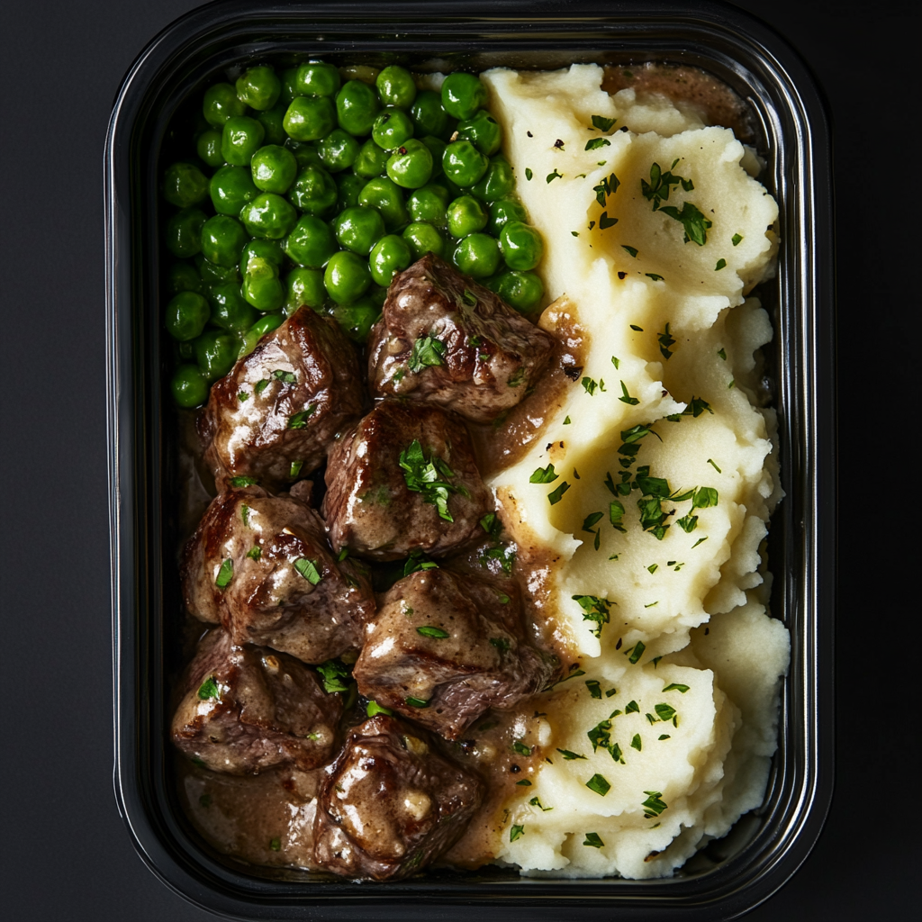 flank steak, yellow potatoes, peas, olive oil, parsley, lite-cream, parmesan, salt, garlic, onion, black pepper, cream cheese