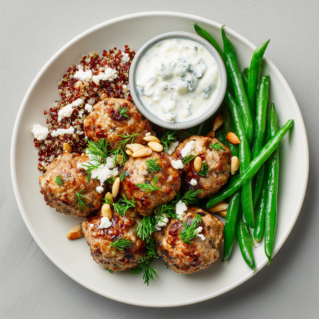 ground turkey, quinoa, green beans, avocado oil, yogurt, cucumber, pine nuts, parsley, lemon, garlic, onion, oregano, breadcrumbs, salt, garlic, pepper, onion powder