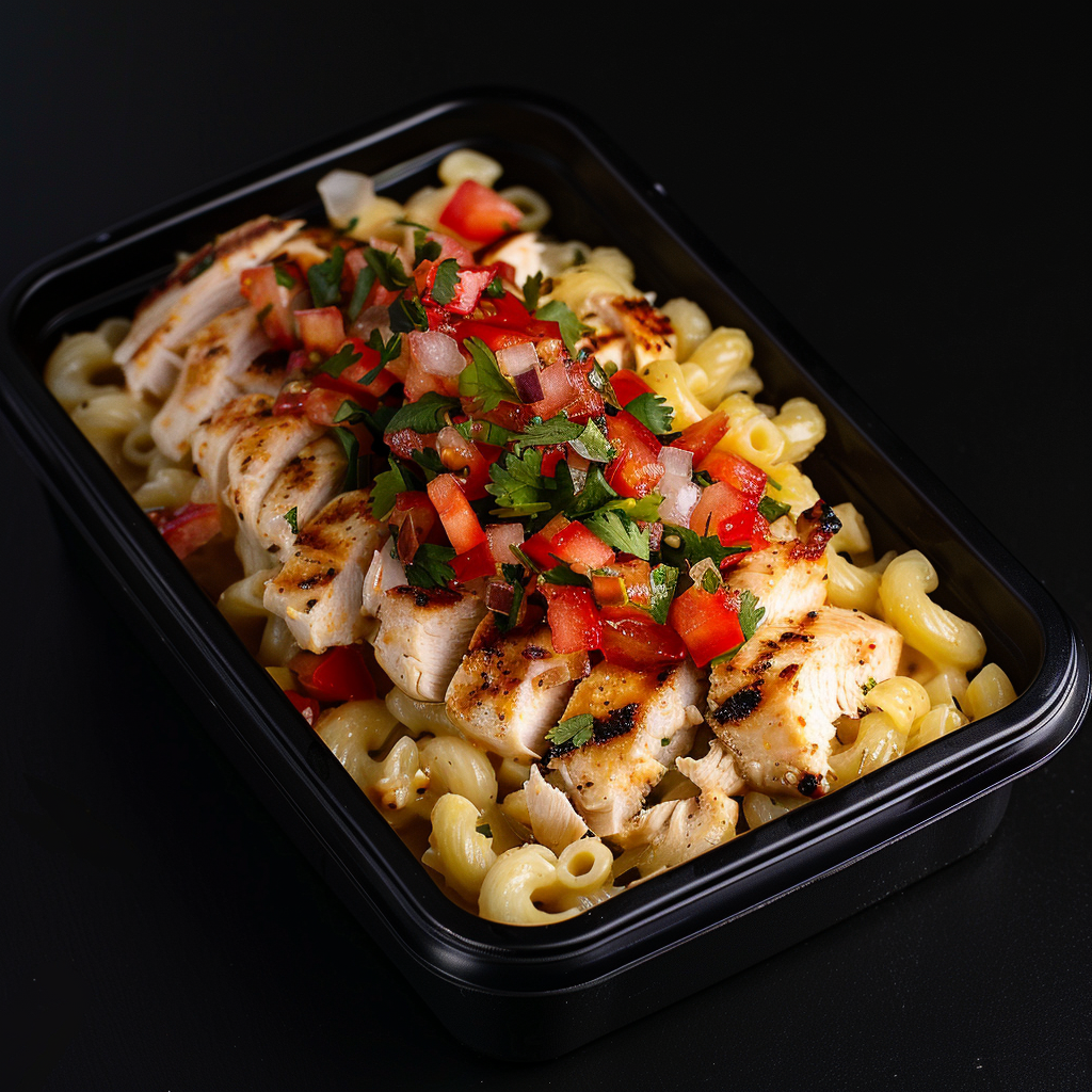chicken, macaroni pasta, tomato, garlic, green chile, red onion, cilantro, white ceddar, cottage cheese, fat-free milk, salt, pepper, olive oil, paprika, garlic powder, onion powder, chili powder