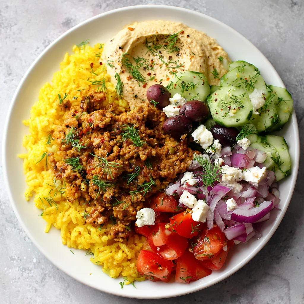 ground turkey, saffron rice, cucumber, tomato, red onion, garlic, olives, feta cheese, dill, olive oil, chickpeas, tahini, lemon, salt, cumin, oregano, italian seasoning, garlic power, onion powder, black pepper