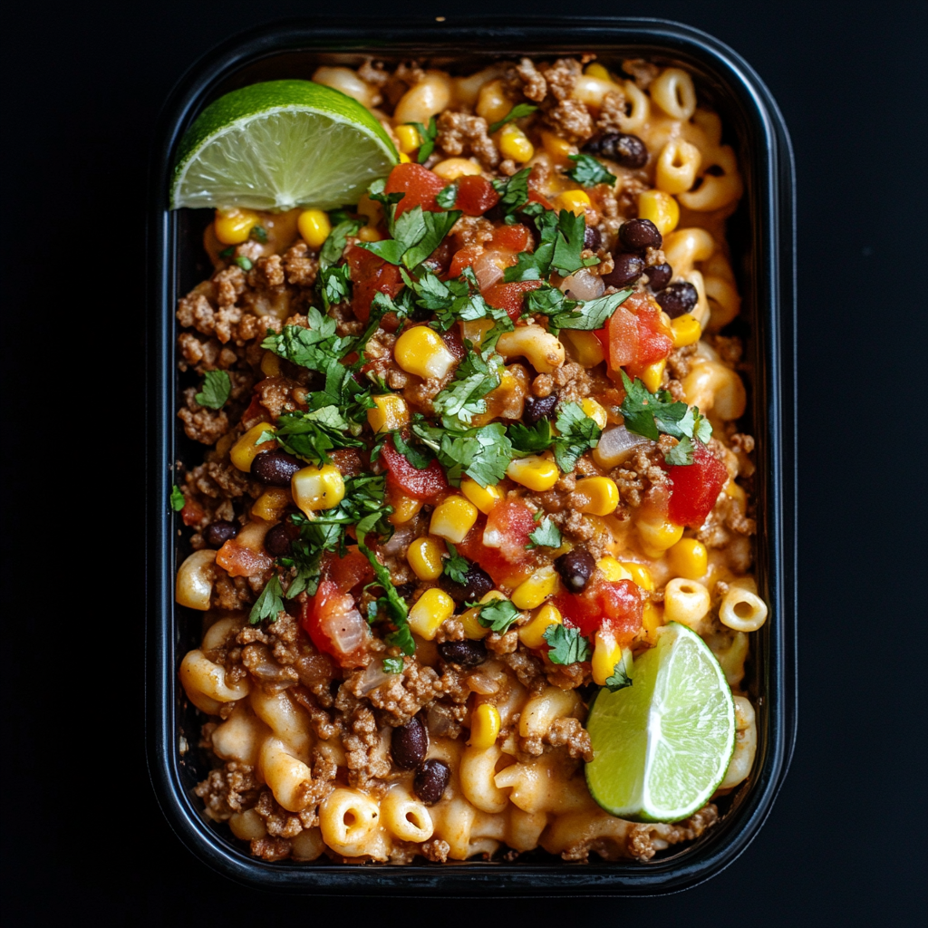 ground turkey, macaroni, cheddar cheese-lite, flour, black beans, corn, tomato, green onion, cilantro, garlic, onion, tajin, lime, paprika, lite-cream