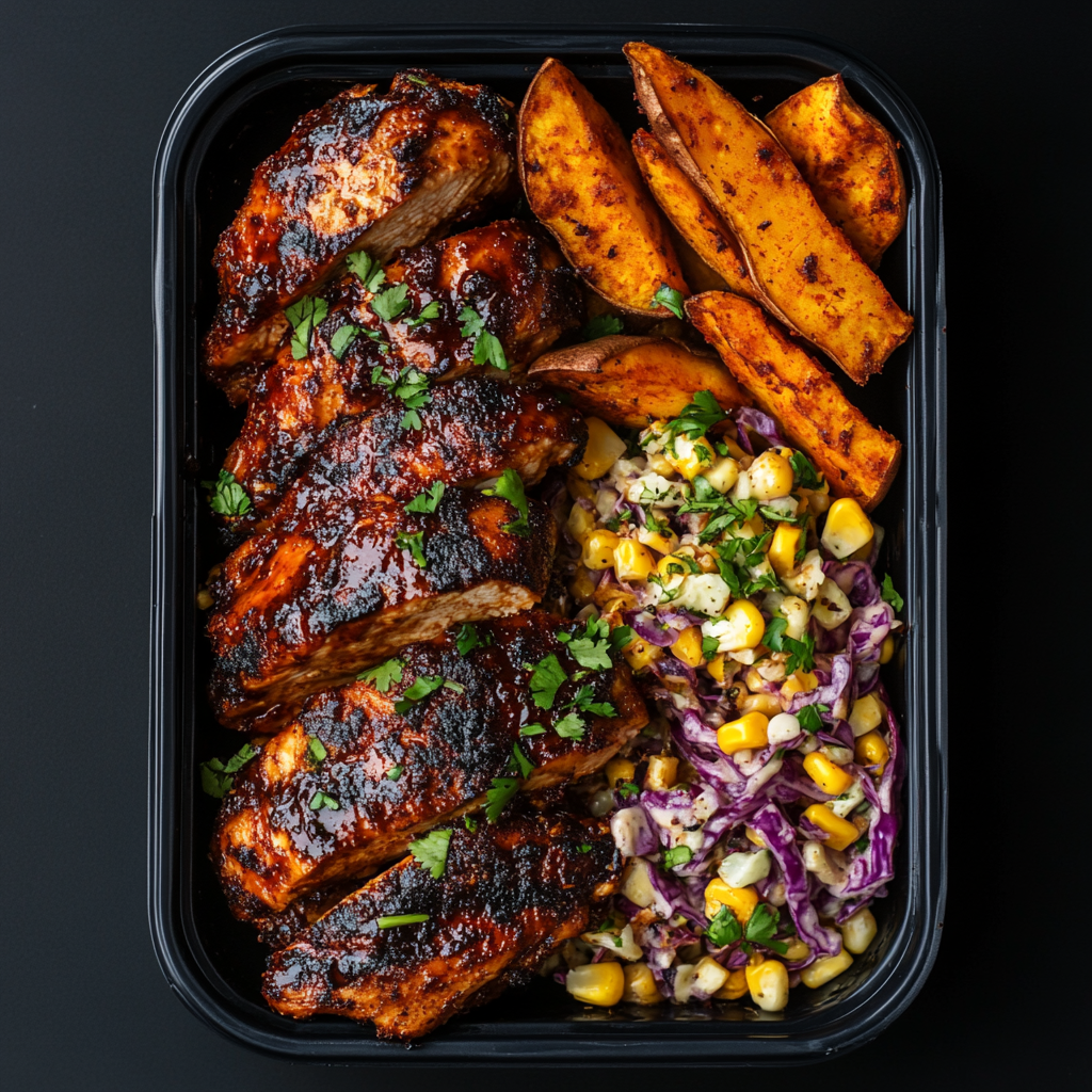 chicken, sweet potatoes, lite-mayonnaise, corn, cabbage, parsley, allspice, green onion, vinegar, lime juice, ginger, garlic, soy sauce, cinnamon, garlic powder, paprika, salt, pepper, olive oil