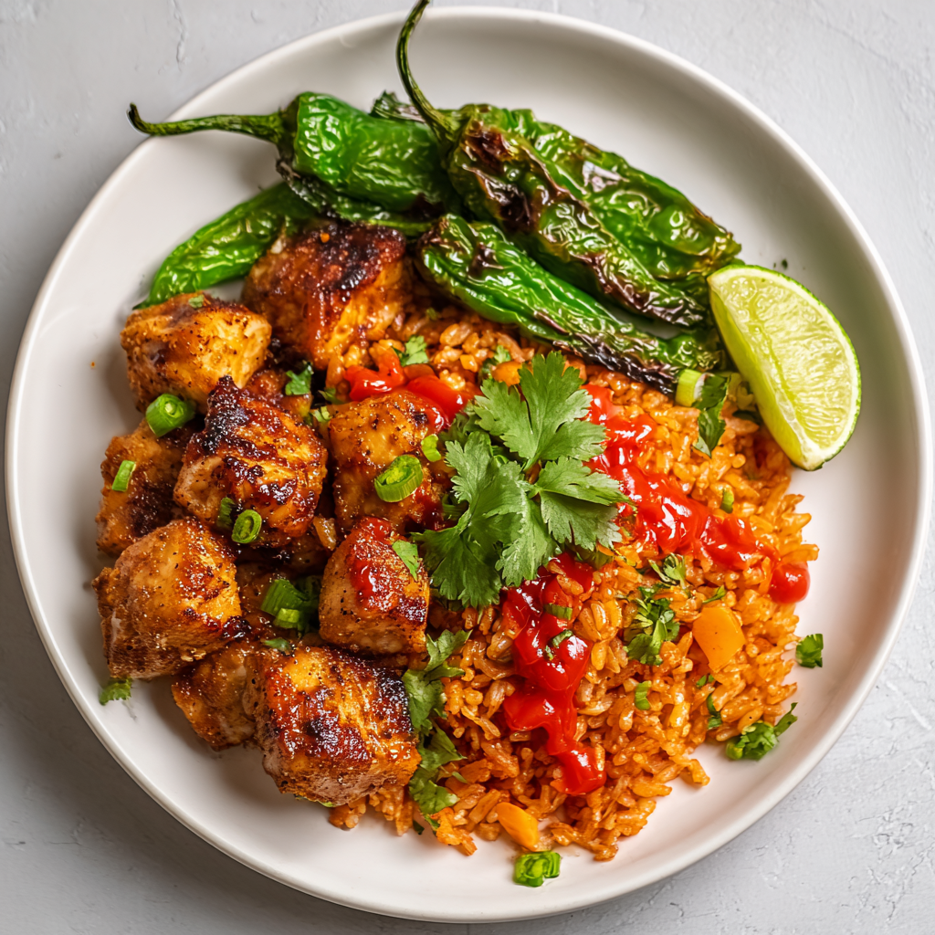 chicken, white rice, shishito peppers, sesame oil, gochujang, thai chilies, sriracha, carrots, soy sauce, garlic, ginger, brown sugar, rice vinegar, scallions, lime, salt, pepper, avocado oil, garlic powder, onion powder, edamame