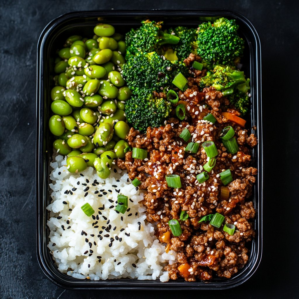 ground beef, white rice, edamame, broccoli, sesame seeds, sesame oil, green onion, garlic, ginger, carrots, soy sauce, rice vinegar, hoisin, white pepper