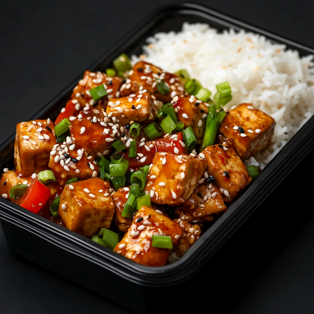 Tender cubed tofu stir-fried with fresh vegetables and coated in a savory, flavorful sauce. Served with white rice and garnished with sesame seeds and green onions.