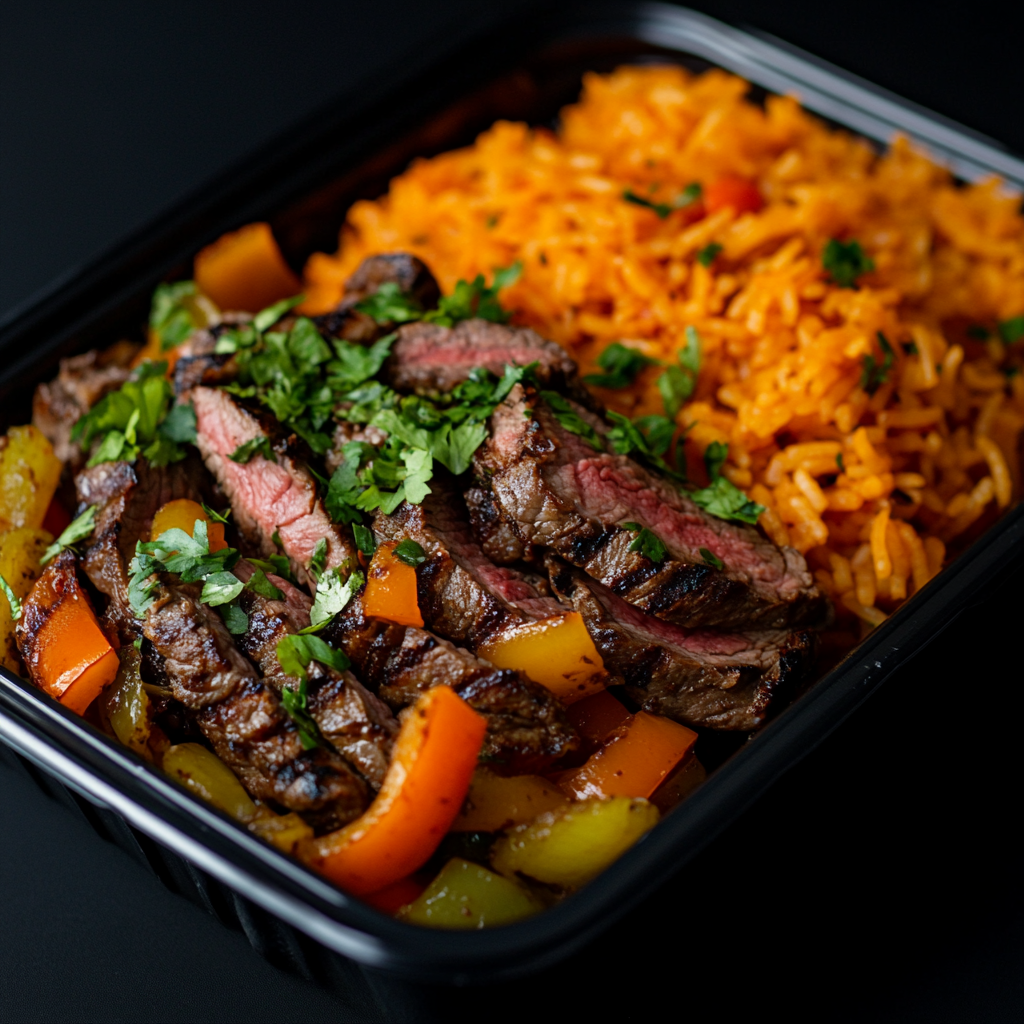 flank steak, white rice, avocado oil, bell pepper, onion, jalapeno, garlic, cilantro, soy sauce, red-wine vinegar, tomatoes, aji amarillo, tomato bouillon, salt, pepper, garlic powder, chili powder