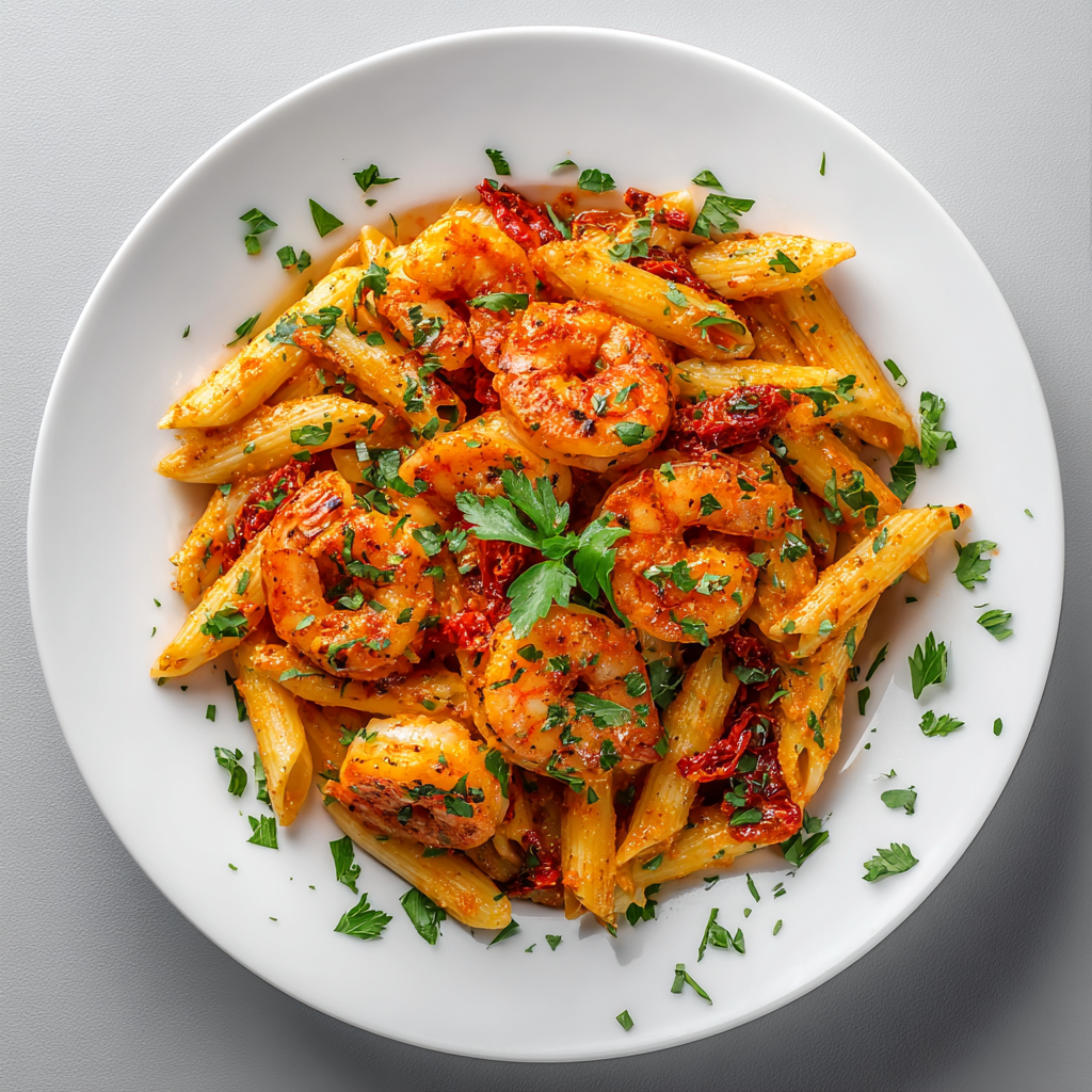 shrimp, penne noodles, garlic, lite-cream, parmesan, red pepper flakes, sun-dried tomatoes, oregano, italian seasoning, paprika, basil, salt, pepper