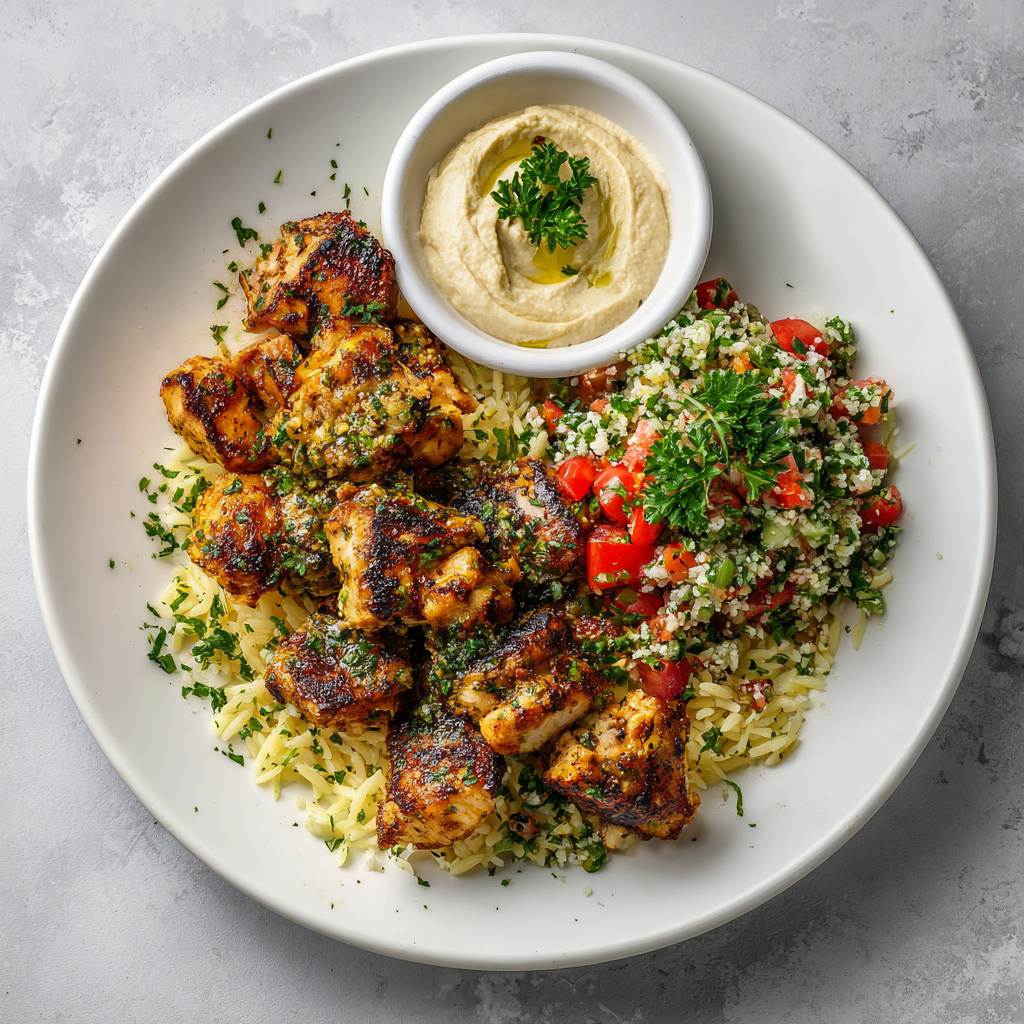 Tender spiced chicken bites paired with a fresh tabbouleh salad over steamed rice. Garnished with fresh parsley and served with hummus on the side.