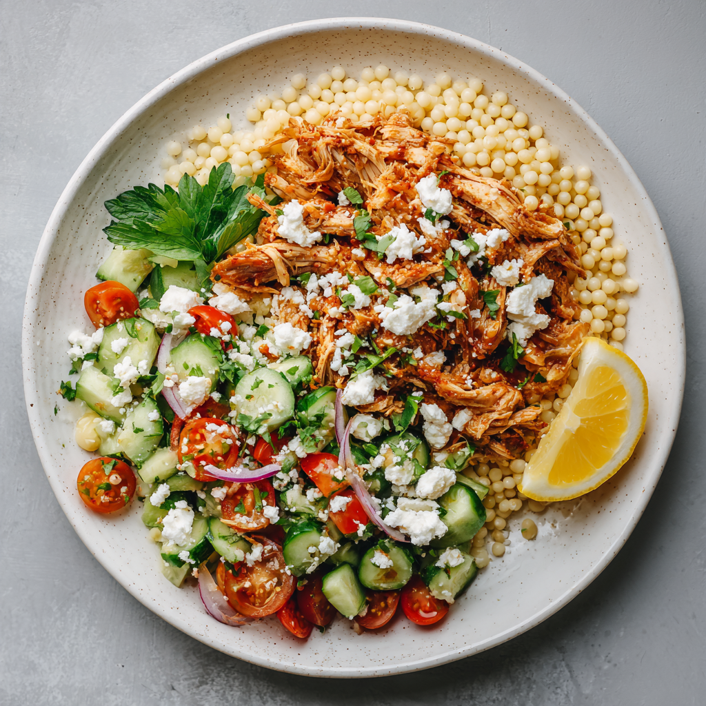 Mediterranean-style shredded chicken served with pearl couscous and a fresh garden salad, garnished with feta cheese and parsley.