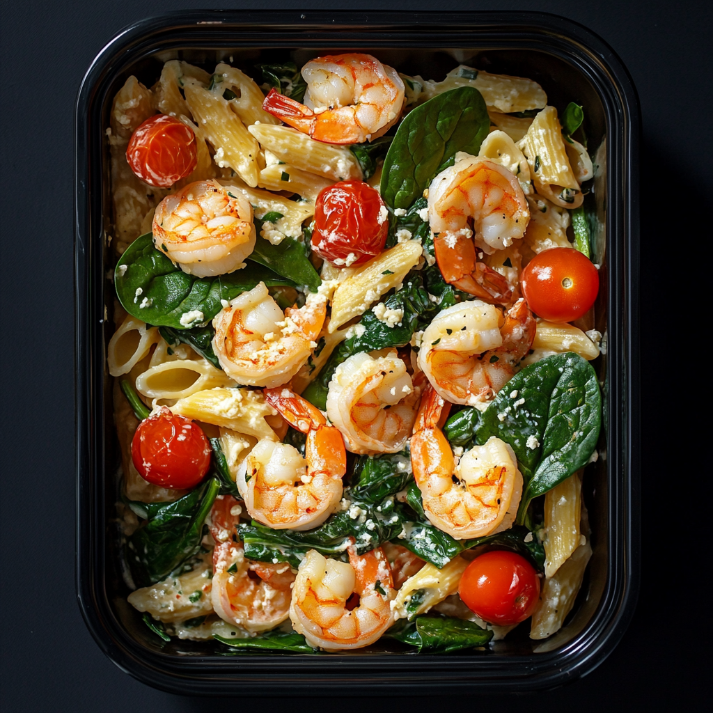 Creamy feta pasta packed with spinach and cherry tomatoes. Sauteed shrimp layered on top with a fresh parsley garnish.