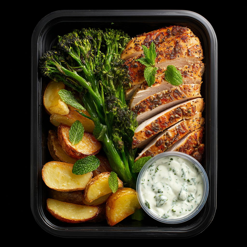 flank steak, roasted potatoes, broccolini, chickpeas, avocado oil, mint, dukkha, yogurt, salt, pepper, cumin, turmeric, ginger, cilantro, cinnamon, paprika, chili pepper