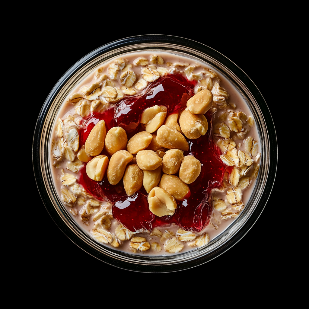 old fashioned oats, chocolate whey protein powder, salt, almond milk, jelly, sugar, peanuts, tree nuts, peanut butter