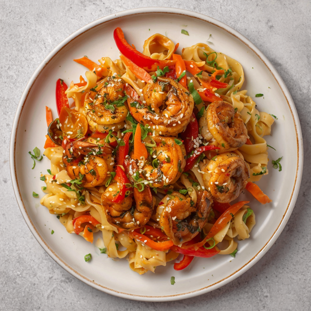 shrimp, egg noodles, avocado oil, peanut butter, soy sauce, rice vinegar, zucchini, bell peppers, peanuts, carrots, green onion, sesame seeds, salt, pepper