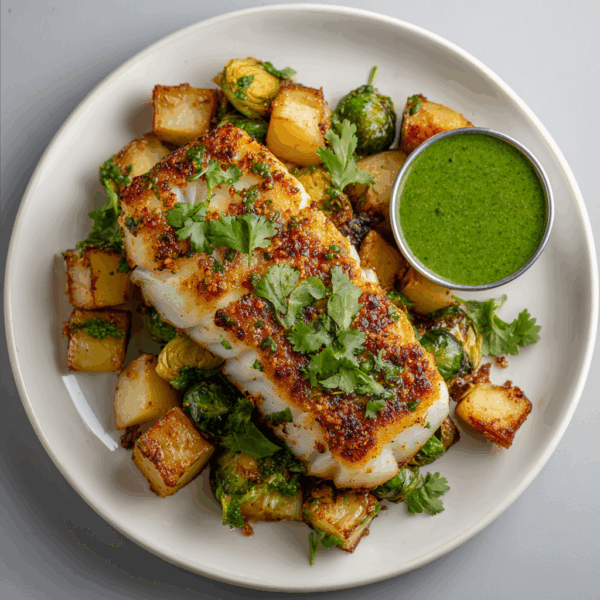 Peruvian-style balsamic glazed cod fillet served over roasted potatoes and Brussels sprouts, accompanied by a cilantro-spiced sauce and topped with crispy onions and fresh cilantro.