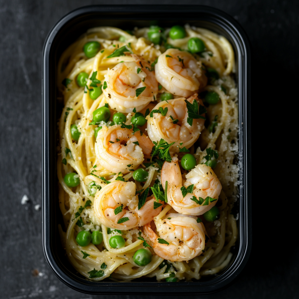 shrimp, spaghetti, pancetta, peas, olive oil, black pepper, cream, egg, oregano, salt, butter, garlic