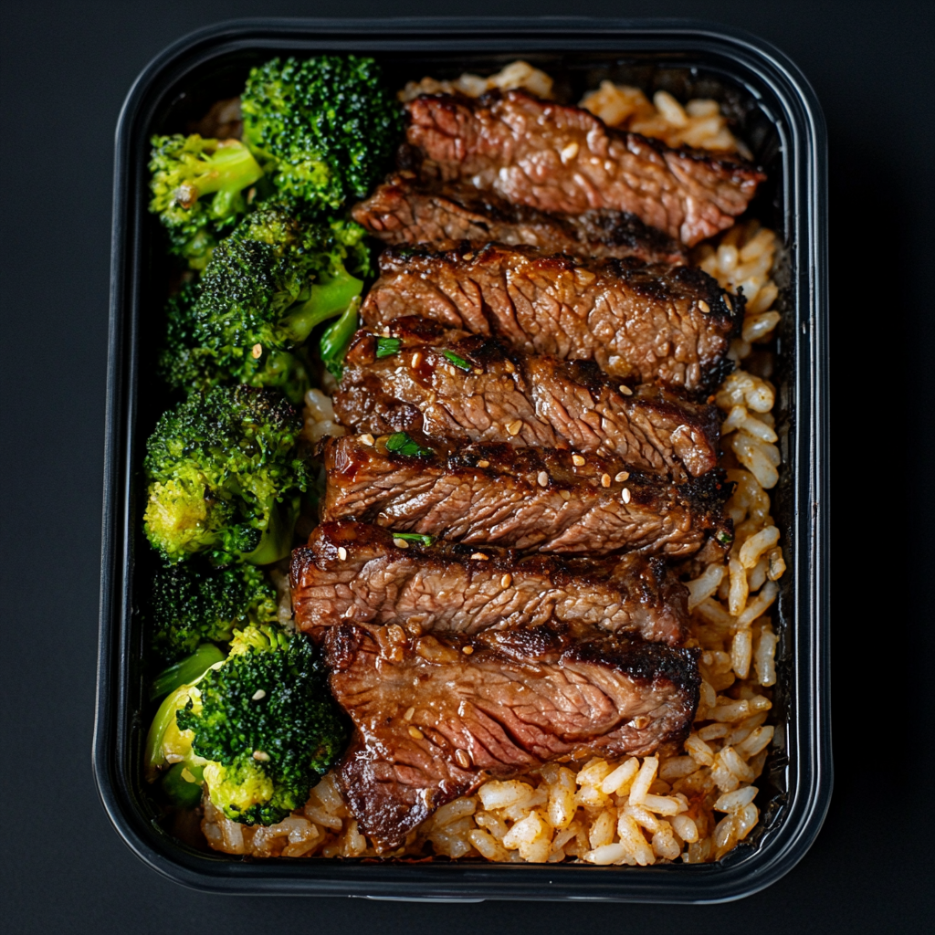 flank steak, jambalaya rice, broccoli, garlic, olive oil, parsley, lemon, salt, pepper, paprika, lemon, tomato paste, jambalaya seasoning