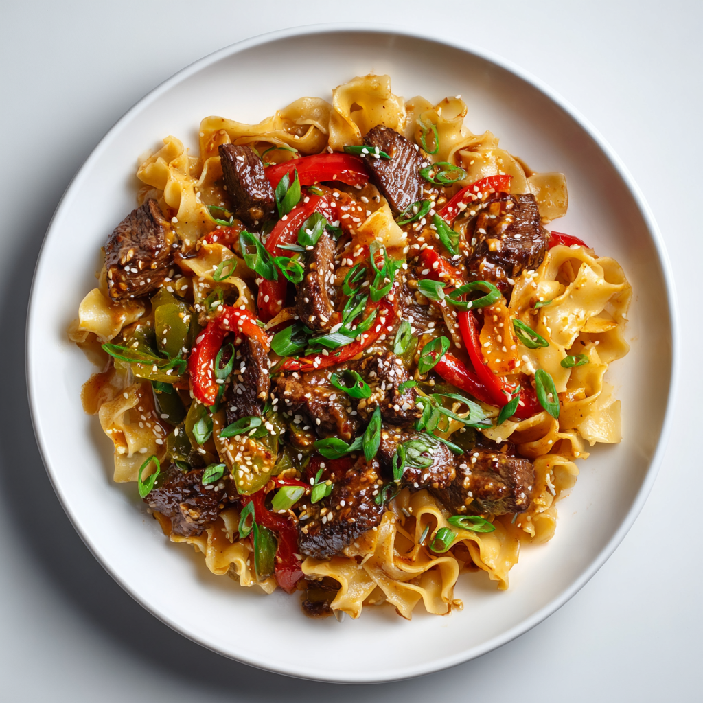 flank steak, egg noodles, peanut butter, chili flakes, bell pepper, green onion, avocado oil, sesame seeds, garlic, chili crisp, soy sauce, lime juice, rice vinegar