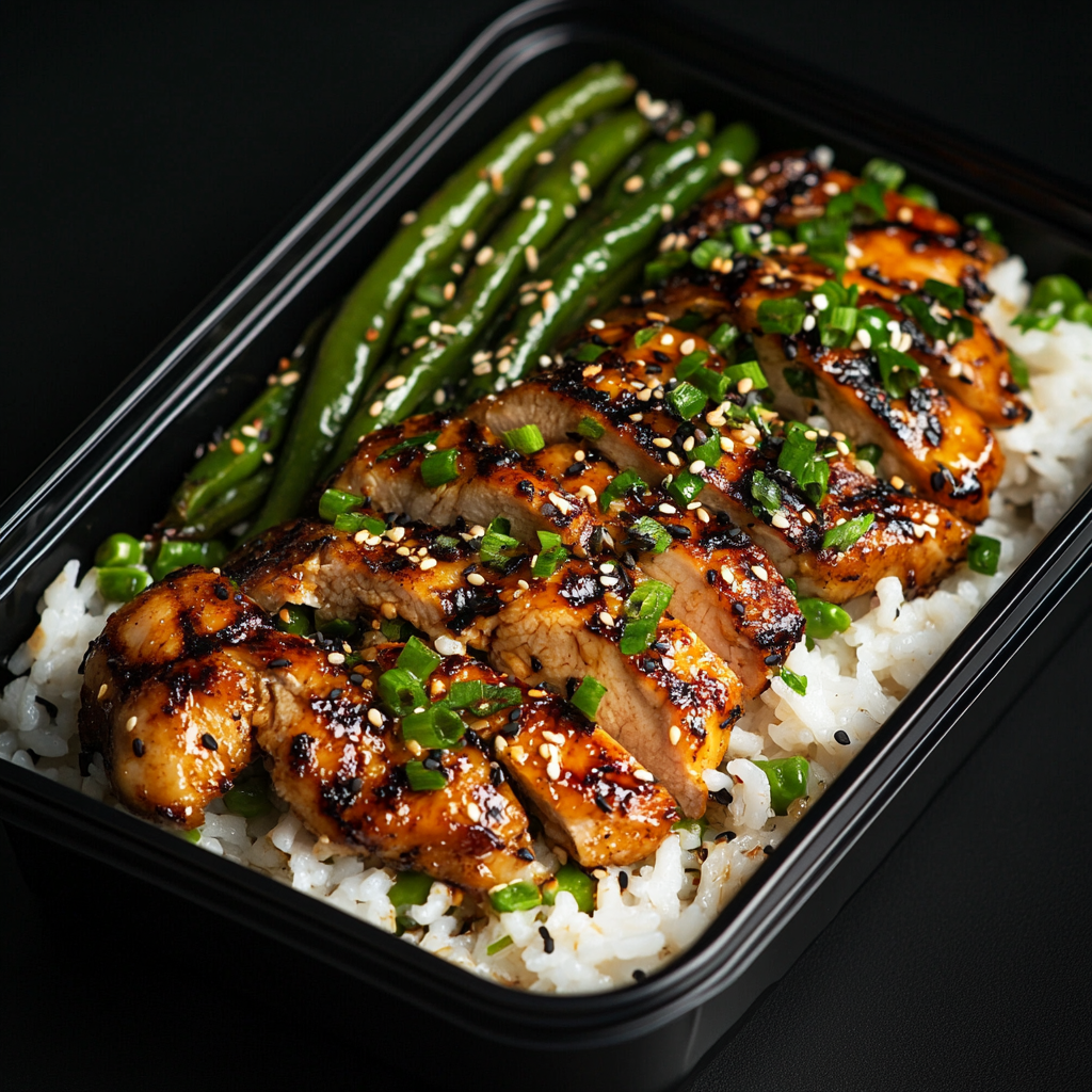 chicken, white rice, green beans, avocado oil, vinegar, soy sauce, garlic, ginger, green onion, sesame seeds