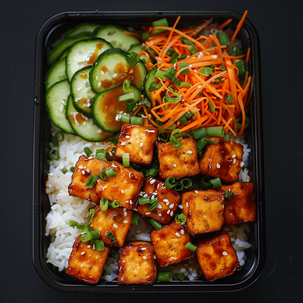 tofu, rice, soy sauce, sesame oil, sesame seeds, brown sugar, honey, ginger, garlic, cornstarch, cucumber, carrots, white pepper, garlic powder, onion powder, green onion