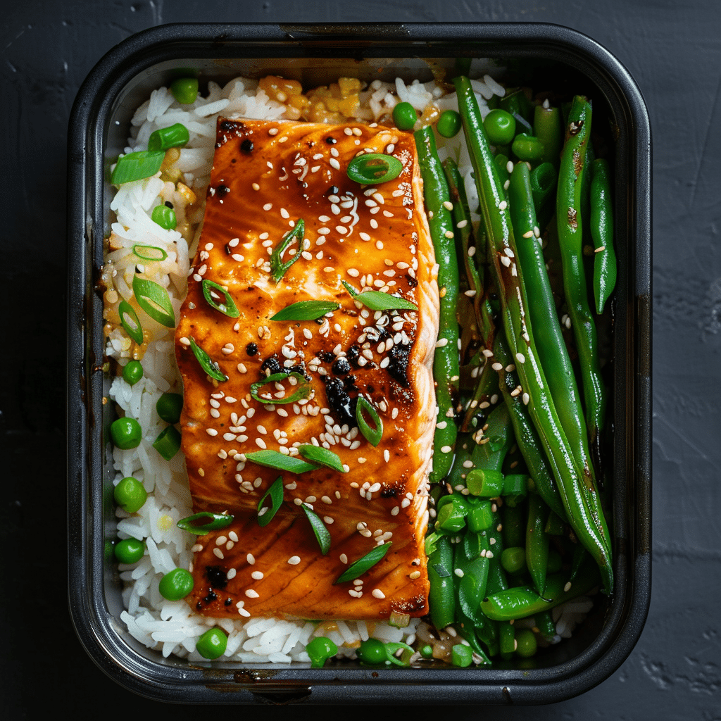 Salmon marinated in a sweet and sour mixture and cooked to perfection. Layered over a bed of white rice and paired next to garlic roasted green beans.