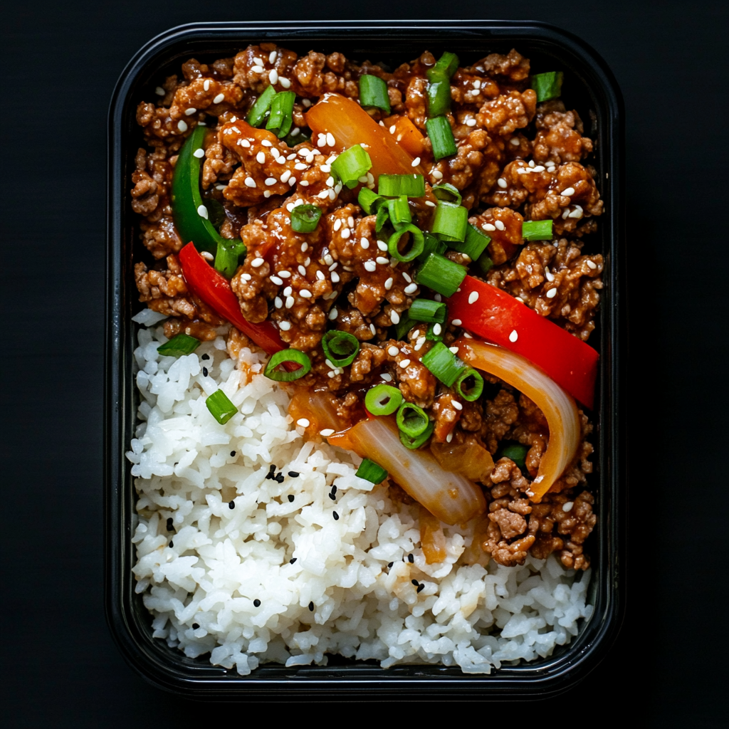 ground turkey, white rice, avocado oil, bell pepper, white onion, soy sauce, ginger, garlic, scallions, sesame seeds, carrots, honey