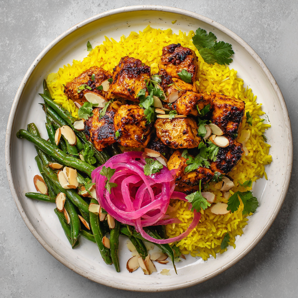 Tandoori spiced chicken bites paired with steamed saffron rice. Paired with baked green beans tossed with sliced almonds. Garnished with fresh cilantro and pickled red onion.
