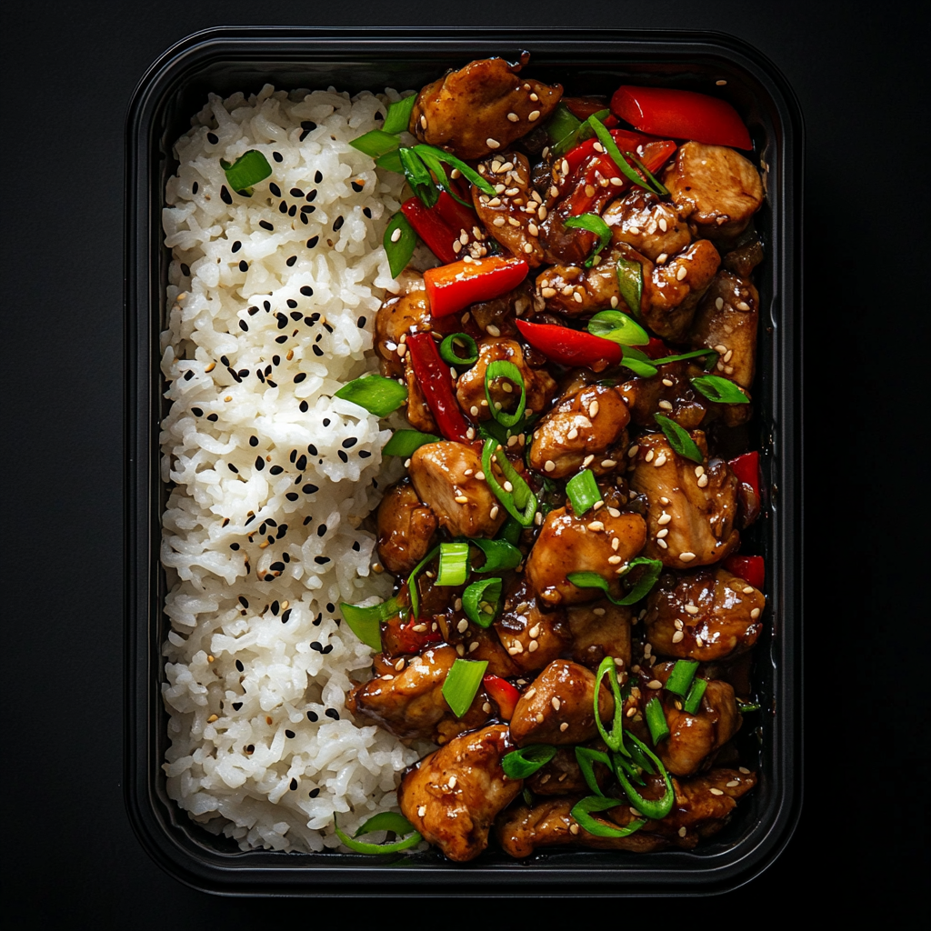 chicken, white rice, green onion, carrots, broccoli, sesame seeds, sesame oil, soy sauce, teriyaki sauce, ginger, garlic, bell pepper