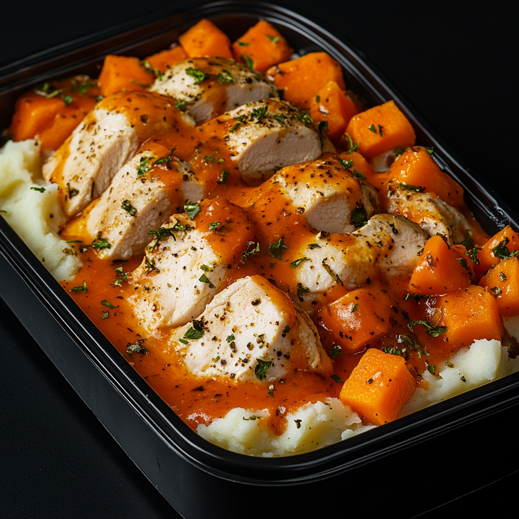chicken, yellow potatoes, carrots, oregano, olive oil, lite-cream, garlic powder, tomato paste, chicken broth, goat cheese, parsley, salt, pepper, onion powder