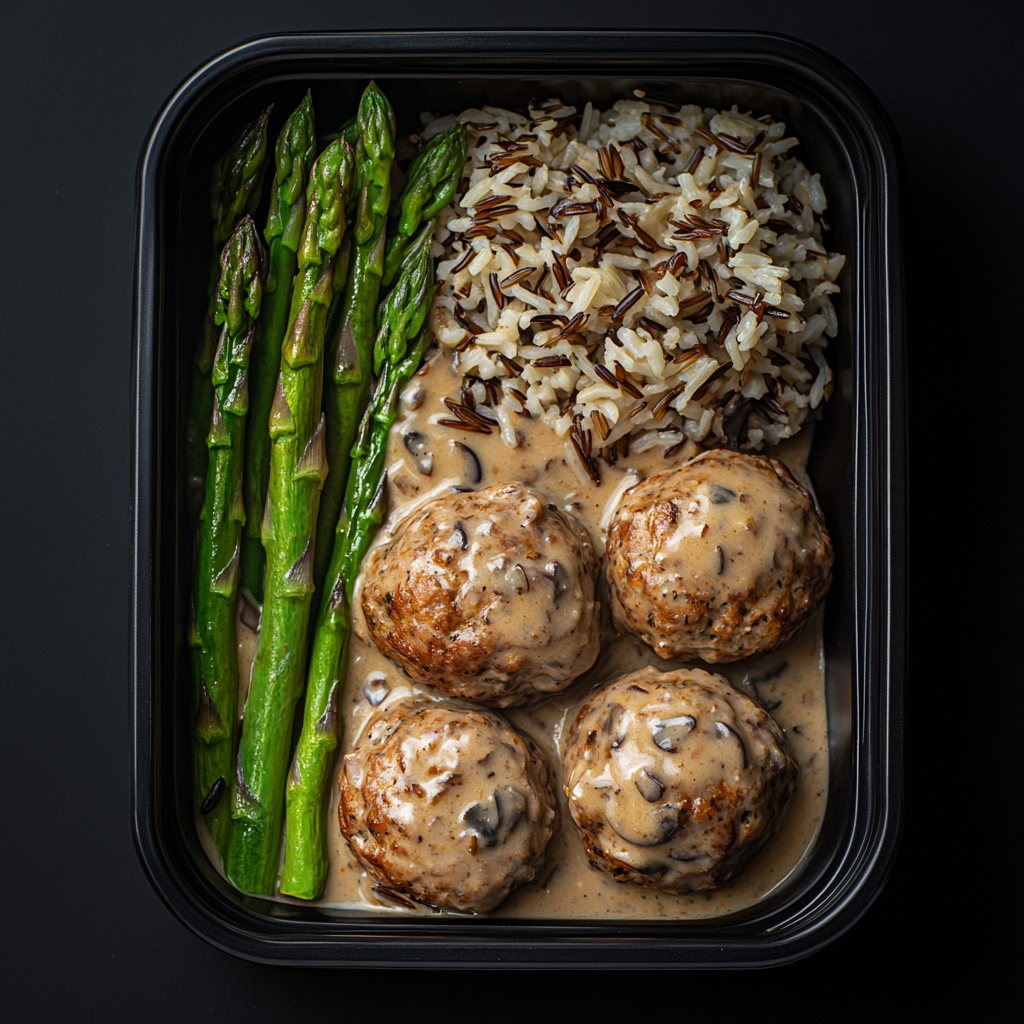 Lean ground turkey meatballs baked then coated in our homemade creamy mushroom sauce. Over wild rice and roasted asparagus