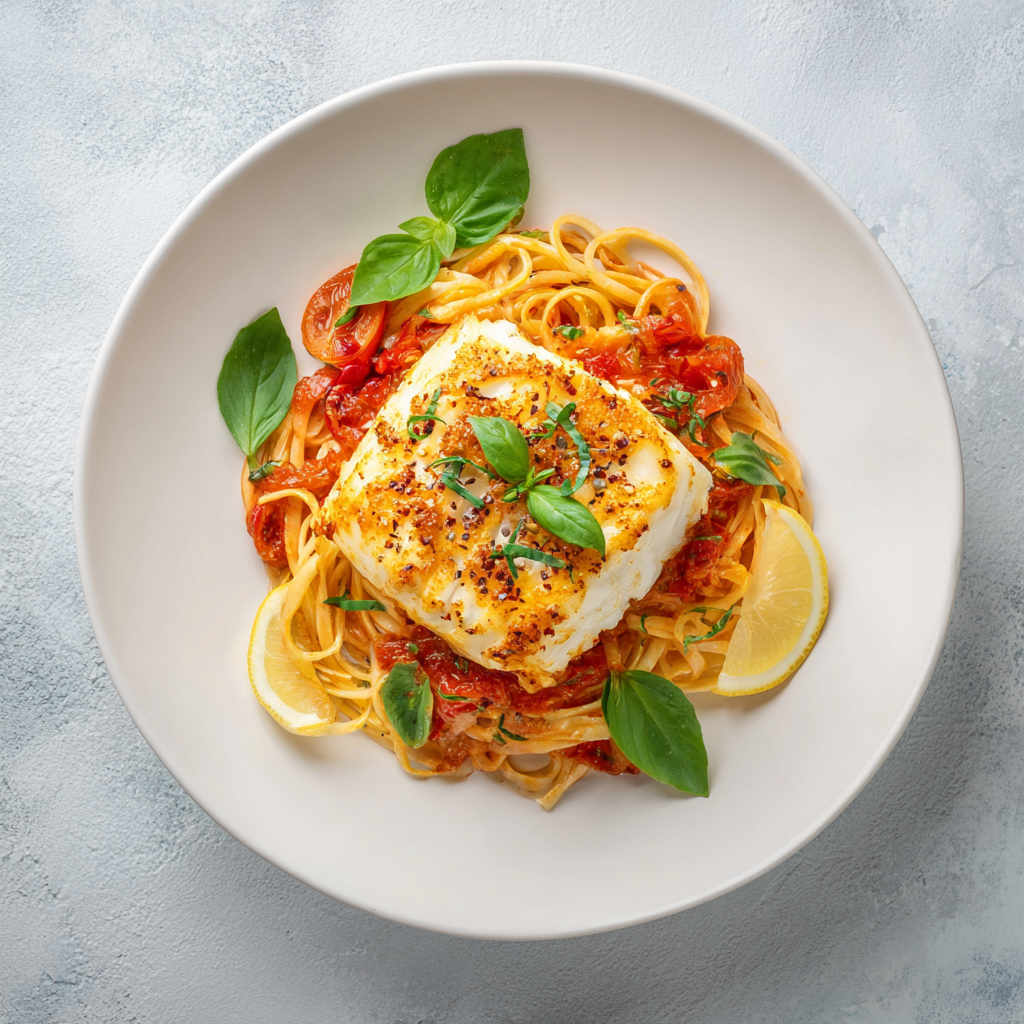 cod, linguini, tomatoes, lemon, oregano, olive oil, basil, garlic, onion, pomodoro sauce, salt, pepper